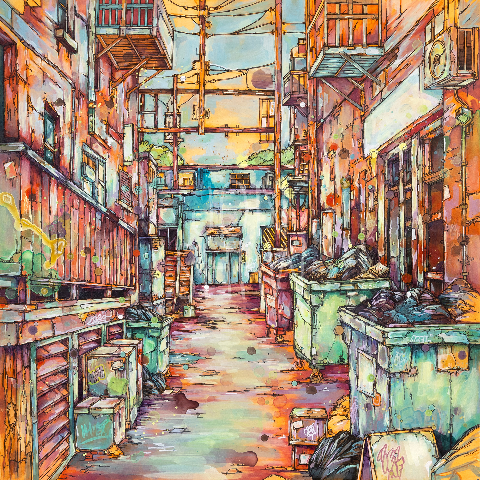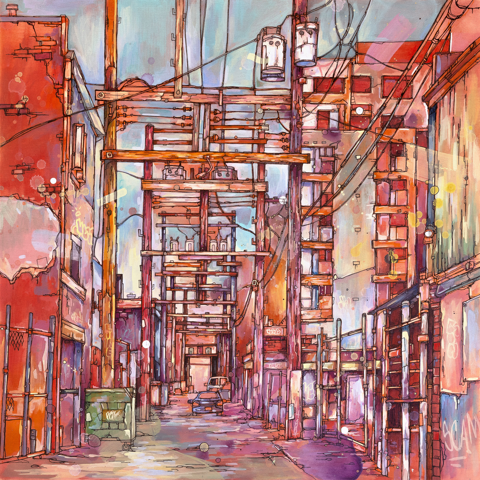 My work documents the metamorphosis of cluttered urban spaces, memorializing the ongoing transformation of familiar locales. It celebrates crumbly detritus, rusty dumpsters, colourful graffiti and remnants of human activity.